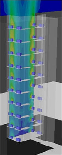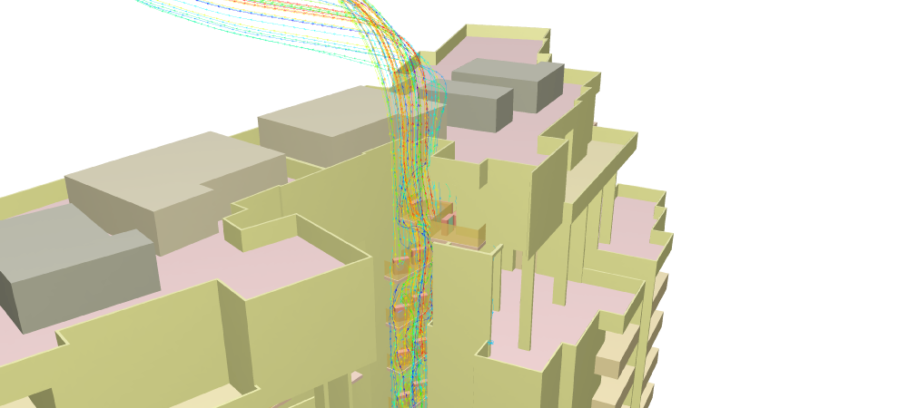 Particles trajectories of exhaust air discharged from exhaust plume fans, indicating entrainment of contaminant into building roof area and