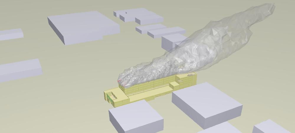Pollutant plume & particles trajectories of exhaust air discharged from exhaust fans, indicating dispersion of contaminant downstream into residential area.