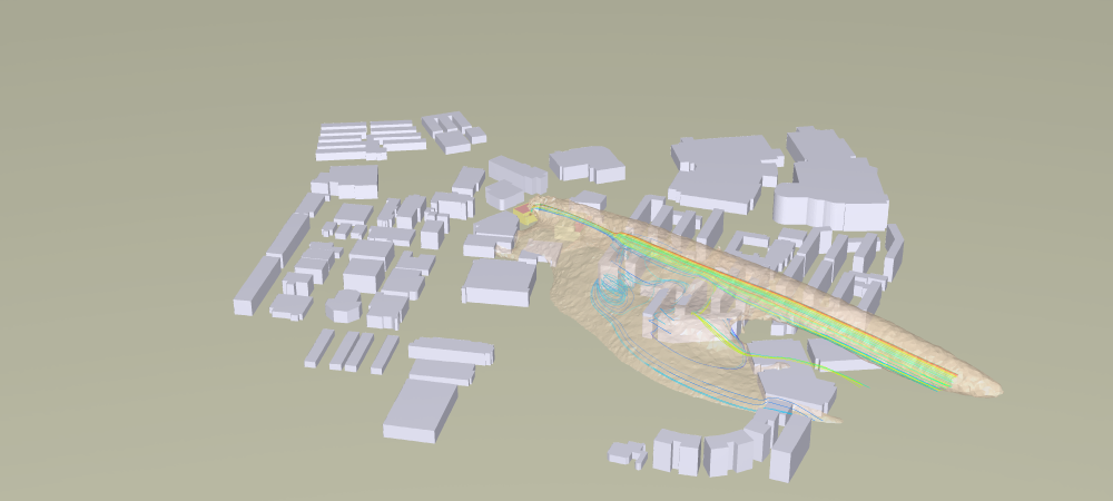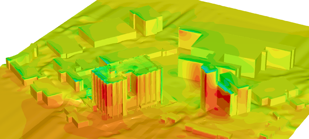 Surface pressure contours on buildings & terrain due to wind loading.